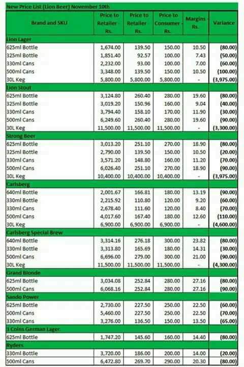 බියර් මිල දැන් පහල යන ආකාරය පිලිබද අදාල චක්රලේඛනයන් දැන් නිකුත්ව තිබේ.මේ අනුව ලයන් ලාගර බියර් බෝතලයක් රු 150ක් ලෙසින් දක්වා තිබේ.කුඩා කෑන් බියර් එකක් රු 130කි.තතු එසේ වුවද මේ පිලිබදව මිගමුවේ කාර්ගිලස් සුපිරි වෙළද සැලෙන් අප කළ විමසිමකදි කියා සිටියේ තම ආයතනය තවමත් බියර් විකුණනු ලබන්නේ පරණ මිලටම බවය.