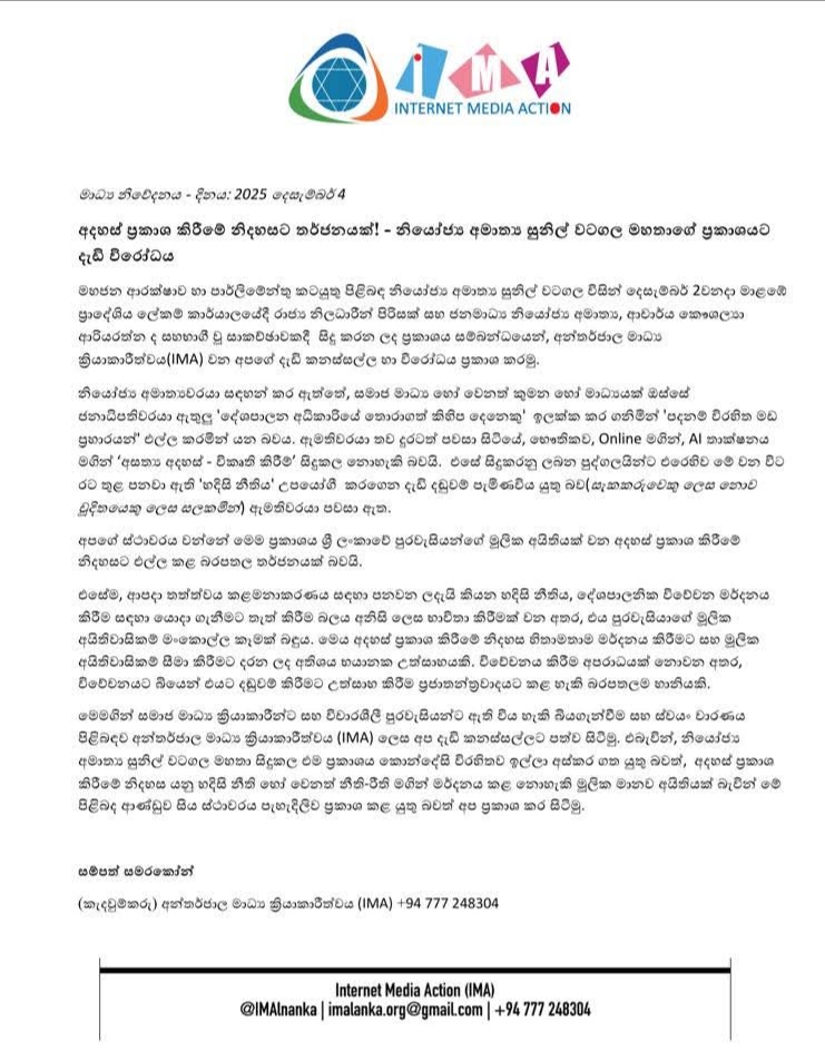 සිදු කරන ලද ප්‍රකාශය සම්බන්ධයෙන්, අන්තර්ජාල මාධ්‍ය ක්‍රියාකාරීත්වය(IMA) වන අපගේ