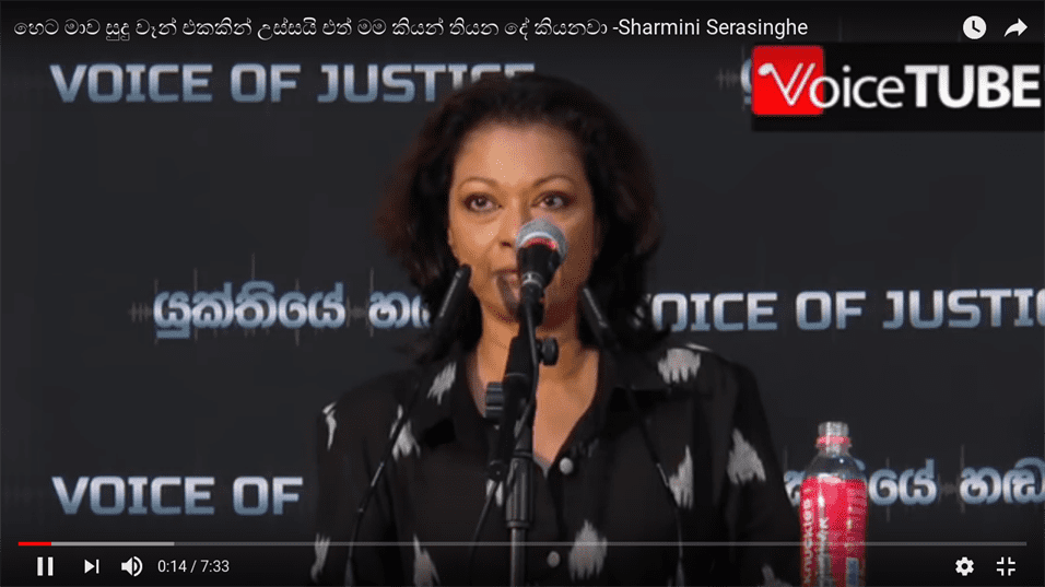 Screenshot from 2018-12-07 12-35-29(12.30 pm ) යුක්තියේ හඩ පසුගියදා විහාරමහා දේවි උද්‍යානයේදි පැවැති කලාකරුවන් විද්වතුන්ගේ හමුවේදි ඉතා තියුණු අභියෝගාත්මක කථාවක් සිදුකළ ජේෂ්ඨ මාධ්‍යවේදිණියක වන ගාමිණි සේරසිංහ මහත්මිය කියා සිටියේ 62 ලක්ෂකට දුන් පොරොන්දු සහ ඒ ගැන විශ්වාසයන් කඩකිරිම හේතුවෙන් ඇය ජනපති සිරිසේනට එරෙහිව පොලිසියට පැමිණිල්ලක් සිදුකළ බවත් රටේ පුරවැසියන්ටද එසේ කළ හැකි බවත්ය.