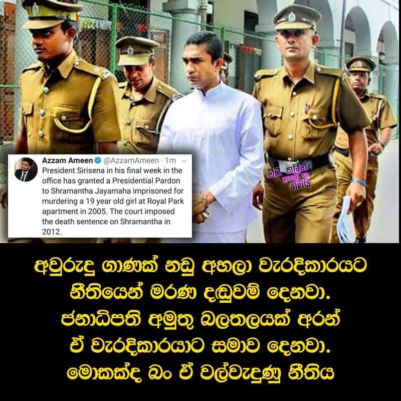 ලංකාවේ නීති පොත් අළුත් කරමින් විශේෂයෙන්ම විත්ති පාර්ශවයේ ධනය හා බලය ඉදිරියේ නොනැමී අපරාධ පරීක්ෂණ දෙපාර්තමේන්තුව කල විශේෂ පරිශ්‍රමයක ප්‍රතිඵලයක් ලෙස එල්ලුම් ගහට නියම කරපු අපරාධකරුවෙක් තමයි අද මෙහෙම සිය විධායක බලතල යොදා ගනිමින් ජනාධිපතිවරයා විසින් විශේෂ සමාව යටතේ නිදහස් කරන්නේ. ඒ නිදහස් කරපු අරමුණ නම් අපි දන්නෑ. සමහර විට ඔහුගේ පවුලේ වත්පොහොසත්කම් නිසා වෙන්න හෝ ඔහු බන්ධනාගාරය තුලදීම පශ්චාත් උපාධිය දක්වා ඉගන ගත්ත නිසා වෙන්න පුළුවන්. ඒත් ප්‍රශ්නේ තියෙන්නේ ත්‍රස්තවාදී ප්‍රහාරයකින් එක දින මිය ගිය ජීවිත 300ක් විතර ප්‍රමාණයක් බේර ගන්න පාවිච්චි නොකරපු විධායක බලතල මේ එක ජීවිතයක් බේර ගන්න ලෝස් නැතුව පාවිච්චි වෙන එක. ඒකත් මේ ගෙදර යන්න ලෑස්ති වෙන අල්ලපනල්ලේ.