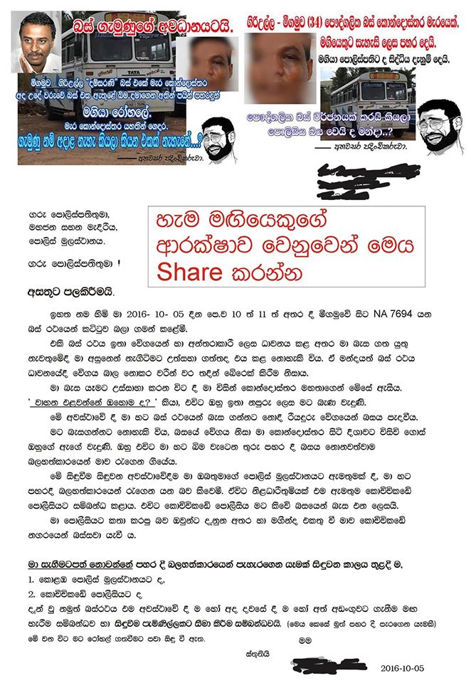 දළුපත ප්‍රෙද්ශයේ  ජීවත්වන ප්‍රසන්ත ඉලංගකෝන් මහතා පසුගිය ඔක්තෝම්බර් 05 වනදා කොළඹ -හලාවත මාර්ගයේ NA7694 බස්රථයේ ගමන් කරමින් සිටියදී කොන්දොස්තරවරයාගේ පහර කෑමකට ලක්වී තිබේ.  බස් රථයෙන් බැසීමට සූදානම් වූ අවස්ථාවේදී බසයේ වේගය පාලනය කරන ලෙස කොන්දොස්තර මහතාට සිය  විරෝධය පළකර ඇති අතර එම අවස්ථාවේදී කොන්දොස්තර විසින් ප්‍රසන්තට බැනවැදී මුහුණට පහර කීපයක් එල්ල කර තිබේ. පසුව අදාළ ස්ථානයේ  නොනවත්වා ඔහුව බසයේ දිගටම රැගෙන යන විට ඔහු විසින් පොලිසියේ මූලස්ථානය වෙත දුරකථන ඇමතුමක් ලබාදී තමන්ට සිදුවෙමින් ඇති කරදරය පවසා තිබේ. පසුව මූලස්ථානයෙන් දුරකථන ඇමතුම කොච්චිකඩේ පෙලීසියට සම්බන්ධ කර ඇත. කොච්චිකඩේ පොලීසියෙන් පවසා ඇත්තේ බසයෙන් බැස පොලීසියට පැමිණෙන ලෙසයි. කෙසේ හෝ ප්‍රසන්තව බසයේ සිටි මගීන් කීපදෙනෙකු කොච්චිකඩේ නගරයේදී බසයෙන් බිමට බස්සවා ඇත. පසුව මේ සම්බන්ධයෙන් පැමිණිල්ලක් සටහන් කර ඇති අතර ඔහු ප්‍රතිකාර සඳහා රෝහල් ගතව ඇත.