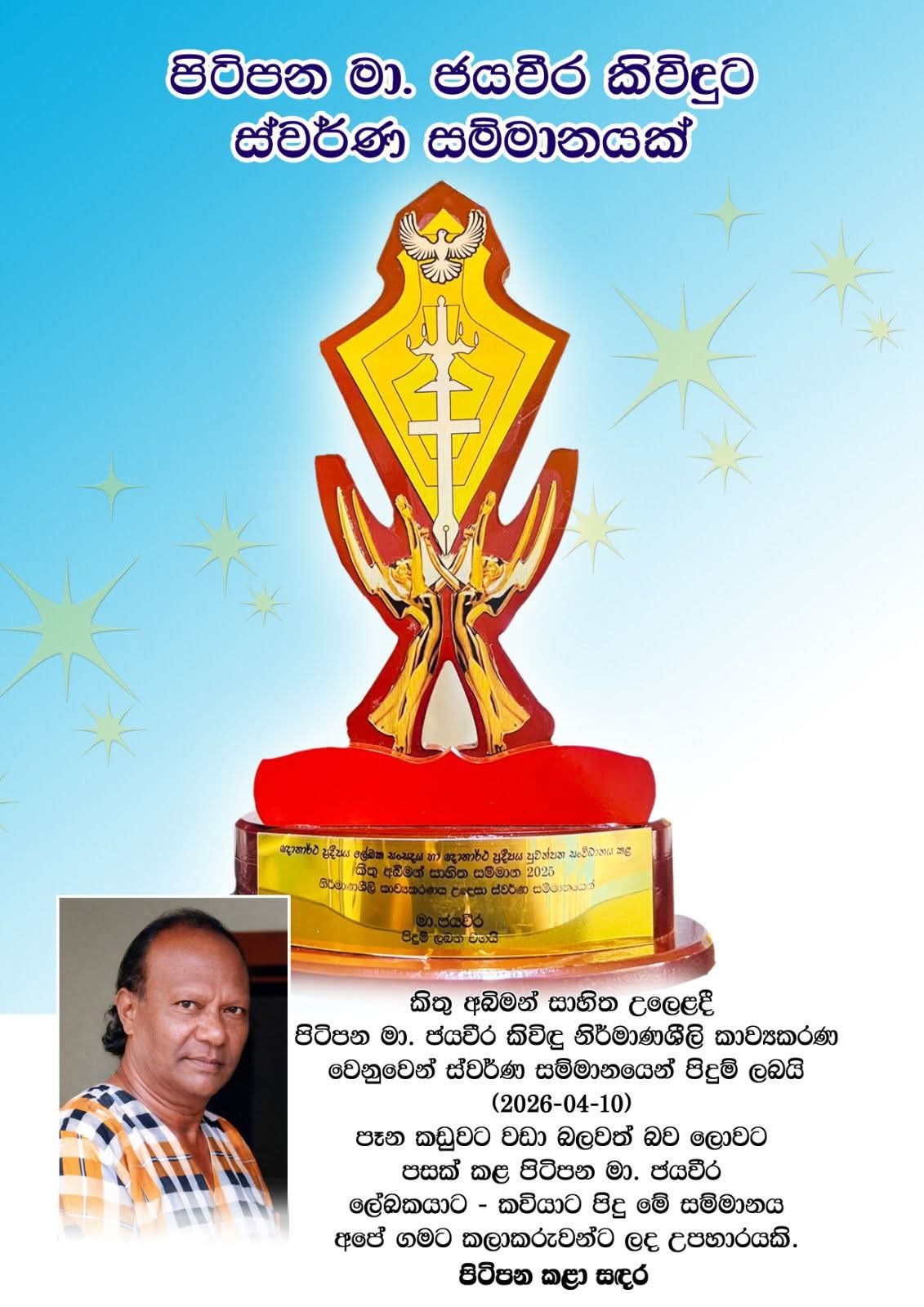 මේ අතර මා.ජයවීර කවියාණන් පසුගියදා තවත් සම්මානයකින් පිදුම් ලැබීය.