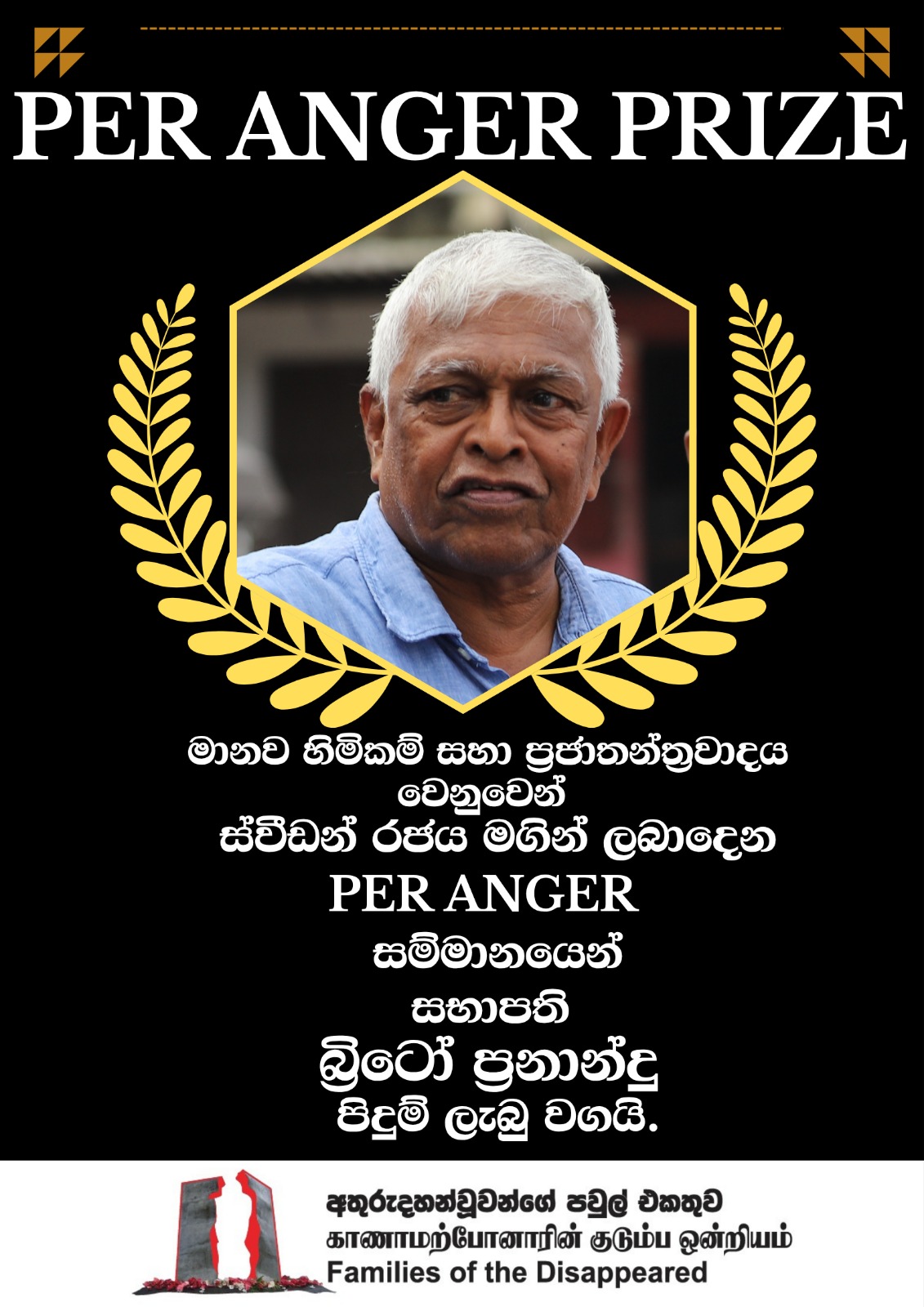 මානව හිමිකම් සහ සමාජ ප්රජාතන්ත්රවාදය වෙනුවෙන් ස්වීඩන් රජය මගින් ලබාදෙන පර් ඇන්ගර් (Per Anger prize) සම්මානයෙන් මානව හිමිකම් ක්රියාකාරී , අතුරුදහන්වූවන්ගේ පවුල් එකතුවේ සභාපති බ්රිටෝ ප්රනාන්දු මහතා පිදුම් ලැබ තිබේ.