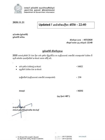 ( 11.30 am ) බ්රැන්ඩික්ස් සහ පෑලියගොඩ කොරෝනා පොකුරට ඊයේ (21) පස්වරු 10.40 වනවිට තවත් ආසාදිතයන් 230 දෙනෙකු එක් වී තිබේ. එම පිරිසත් සමග ඊයේ දිනය තුළදී හඳුනාගත් සමස්ත ආසාදිතයන් සංඛ්යාව 487 ක් දක්වා ඉහළ ගොස් තිබුණි
