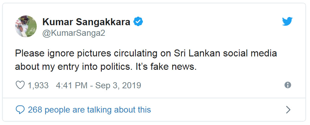 තමන් දේශපාලනයට එක්වූ බව සදහන් කරමින් ශ්රී ලංකාව තුල සමාජ මාධ්ය හරහා සිදුවන ප්රචාරයන්ගේ කිසිදු සත්යතාවයක් නැතැයි ශ්රී ලංකා ක්රිකට් හිටපු නායක කුමාර් සංගක්කාර පවසයි. ඔහු මේ බව සදහන් කර සිටියේ ඔහුගේ ට්විටර් ගිණුමේ සටහනක් තබමිනි.