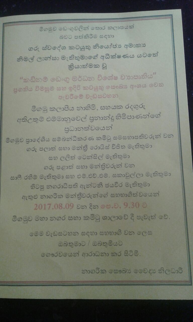 ඒ බස්නාහිර මහඇමතිවරයාගේ නියෝජිතයෙකු , ලෙස මීගමුවේ ඩෙංගු මර්ධනයට එක්වු ඇමති නිමල් ලංසා සිය පවුලේ සාමාජිකයන් හා එක්විම සදහා යළිත් ඕස්ට්රේලියාව බලා යාමට නියමිත බැවිනි.මේ වෙනුවෙන් හෙට විශේෂ රැස්විමක් පැවැත්විමටද නියමිතය.සෞඛ්ය වෛද්ය නිලධාරිවරයා විසින් කැදවා ඇති මෙම රැස්විමේදි ඩෙංගු මර්ධන වැඩසටහන සෞඛ්ය අශයට පැවරිමට නියමිත බවද එහි සදහන්ය.(ඩෙංගු ඇතුලු වසංගත රෝග පිලිබදව කටයුතු වන්නේ පළාත් පාලන ආයතනයක සෞඛ්ය අංශය විසිනි.අවාසනාවකට මෙම වැඩපිලිවෙල බරපතල දේශපාලන ව්යපෘතියක් බවට පත්ව තිබුනේ හිටපු නාගරික මන්ත්රීවරයෙකු වු දයාන් ලංසා යටතේය.)