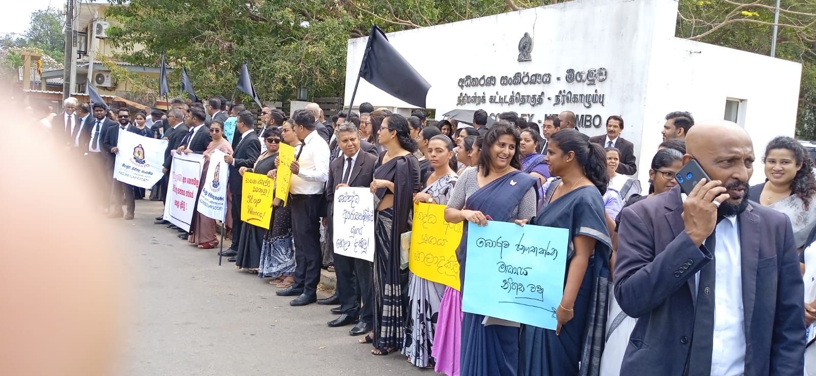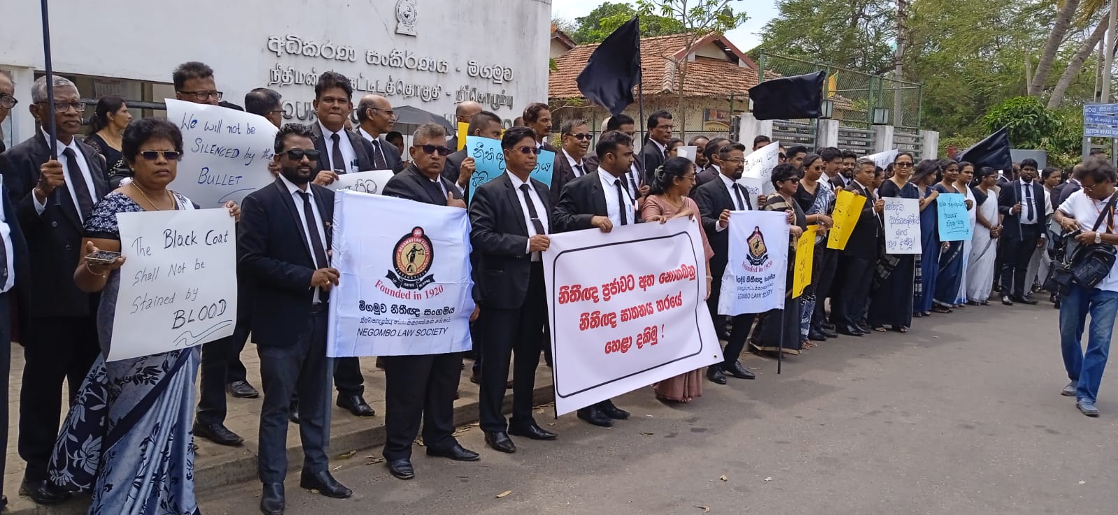 පසුගියදා, බත්තරමුල්ල , අකුරේගොඩ ප්රදේශයේදී නීතිඥවරයෙක් සහ ඔහුගේ බිරිඳ වෙඩි තබා ඝාතනය කිරීමේ සිදුවීමට විරුද්ධත්වය ප්රකාශ කිරීමට සහ වර්තමානයේ රට තුල ඇතිවී තිබෙන ඝාතන සංස්කෘතිය අවසන් කිරීමටත් එලෙසම රටේ සමස්ත ජනතාවගේ ආරක්ෂාව තහවුරු කිරීමටත් රජයට බල කිරීම අරමුණු කර ගනිමින් නීතිඥවරුන් අද දින රට පුරා පවත්වනු ලබන මෙම විරෝධතා මාලාවට සමගාමීව මීගමුව අධිකරණ සංකීර්ණය ආශ්රිතවද මෙම විරෝධතාවය සංවිධානය කර තිබිණි.