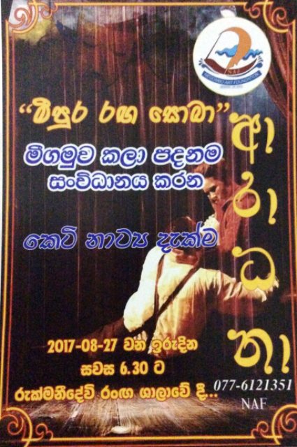 informations මීපුර රග සොබා – කෙටි නාට්ය දැක්ම -27 වන ඉරිදා By fgamage - 2017 August 26 0 349 FacebookWhatsApp මීපුර රග සොබා – කෙටි නාට්ය දැක්ම මීගමුව කලා පදනම සංවිධානය කරන කෙටිනාට්ය දැක්ම ‘මීපුර රග සොබා ‘ අගෝස්තු 27 වන ඉරුදින සවස 6.00ට රුක්මණීදේවී සමරු රංග ශාලාවේදී පැවැත්වීමට නියමිතය.