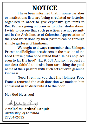 cardinal statementnewmalkae2010කිතුණු දේවස්ථාන වලින් මෙන්ම කිතුණු ආයතනවල සේවය කොට වෙනත් ස්ථාන කරා මාරුවිම් ලැබ සමුගෙන යන කතෝලික පියතුමන්ලාට මිළ අධික තෑගි ලබාදිම සදහා මුදල් එකතුකිරිම කිසිදු අයුරකින් නොකරන ලෙස ඉල්ලමින් කාර්දිනල් මැල්කම් රංජිත් හිමි විසින් විශේෂ නිවේදනයක් නිකුත් කර තිිබේ.