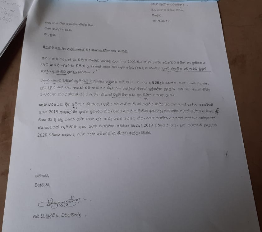 වසර ගනනාවක් තිස්සේ මෙහි නඩත්තු කටයුතු සිදුවන්නේ තමන්ගේ පුද්ගලික වියදම මත යැයි මේ සඳහා ඉල්ලුම් කරන ලිපියේ දක්වා ඇත. නමුත් මීගමුව නගරසභාවේ සේවකයින් විසින් එම කටයුතු සිදුකරනබවට තොරතුරු අපට ලැබී ඇත. මෙවැනි දේවල් සිදුවන නගරසභාවේ ඊට විරුද්ධව කිසිදු හඬක් නැගිමට එ. ජා. ප. හෝ ජේ. වී. පී වැනි කිසිදු පක්ෂයක් ඉදිරිපත්වන්නේ නැත. නමුත් එක්තරා කාලයක ජ. වි. පෙ. සිටි එකම සාමාජිකයා වූ ශිරාන් මන්ත්රීවරයා විවිධ ප්රශ්ණ ඉදිරියේ විරුද්ධත්වය ප්රකාශකරමින් ක්රියාත්මකවූ ආකාරය අපි දැක්කෙමු. අද මේ අය නගරාධිපතිවරයාගේ ජනතාද්රෝහී ක්රියාවන්හිදී ගොළුවන් බිහිරන් සේ හැසිරෙයි. රටේ බලය ඉල්ලා සිටින මේ අය ගමේ සිදුවන මෙවැනි දේවල් තුළ වගකීමක් ඇති අය ලෙස ජනතාවට දෙන පනිවිඩය කුමක්දැයි ඇසිය යුතුව ඇත.