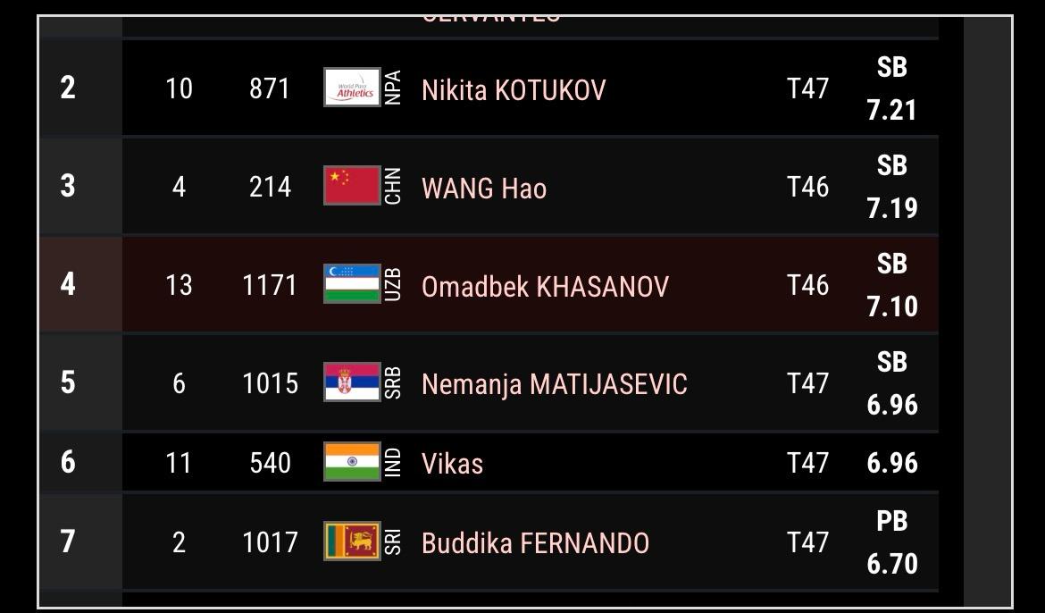 ඒ අනුව ලොව ප්රබල දුර පැනිමේ පැරා ක්රීඩකයන් අතරින් ඔහුට හත්වෙනි ස්ථානය හිමි වී තිබේ.