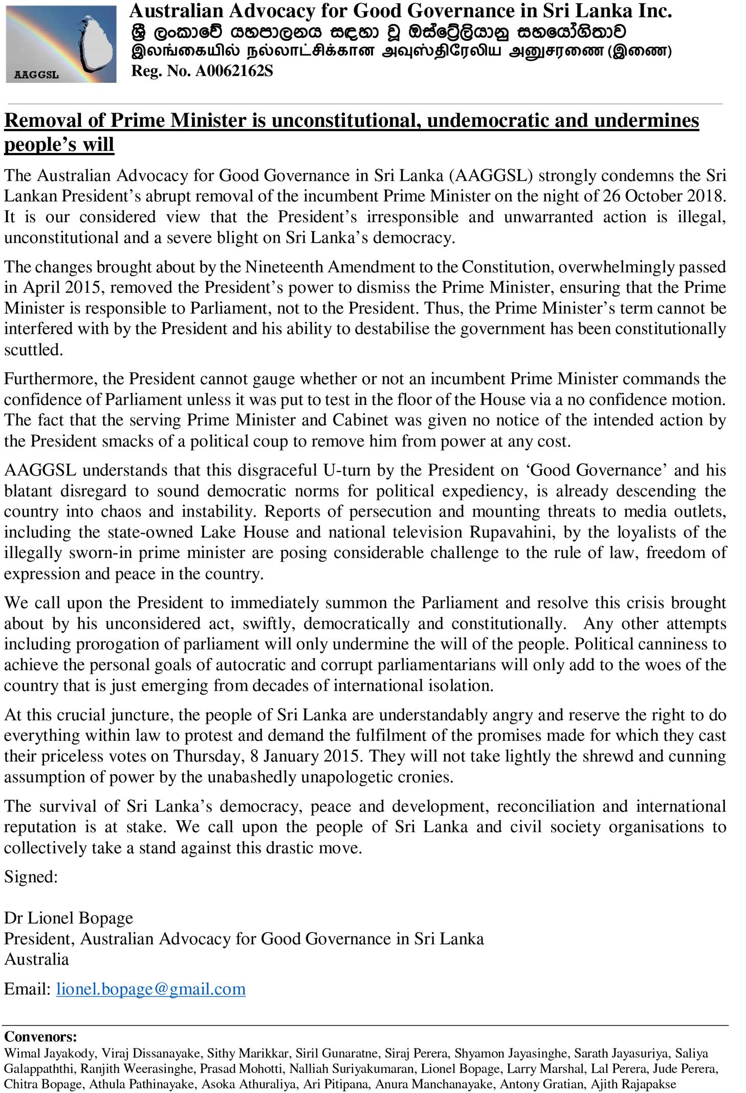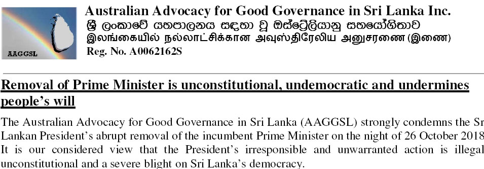 ශ්රී ලංකාව තුළ ඇතිවී තිඛෙන ප්රජාතන්ත්රවිරෝධී දේශපාලන ගැටුම්කාරී තත්ත්වය හෙළාදකිමින් ශ්රී ලංකා ව්ෙ යහපාලනය සඳහා වූ ඕස්ටේලියානු සහයෝගීතාවය විසින් මාධ්ය වෙත ප්රකාශයක් නිකුත් කර තිබේ.
