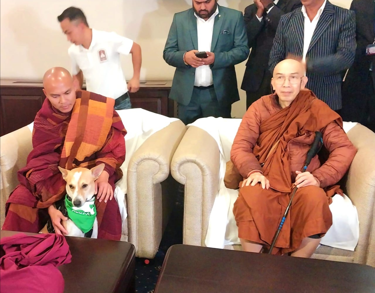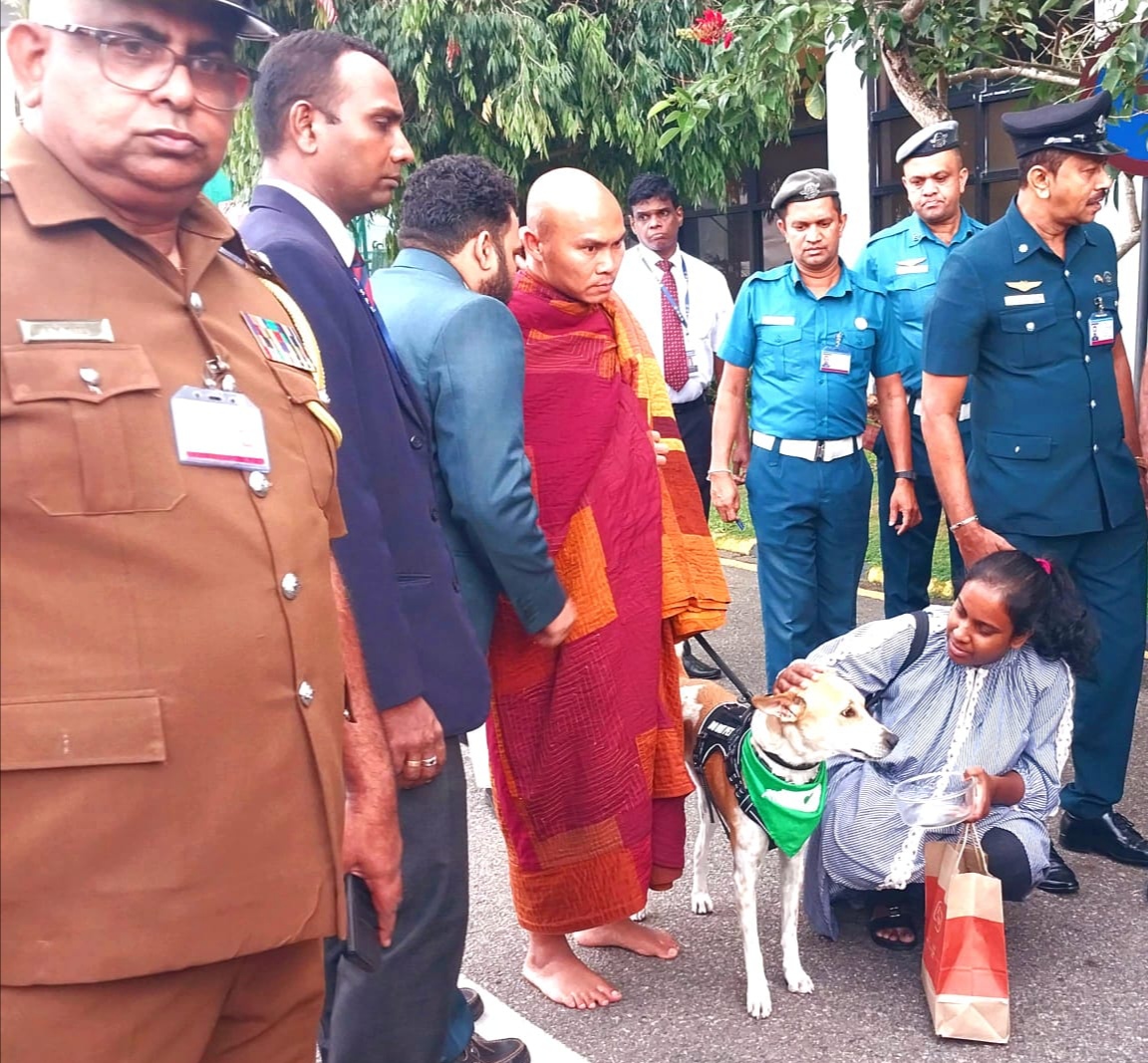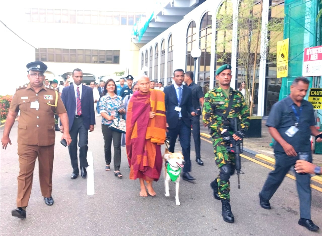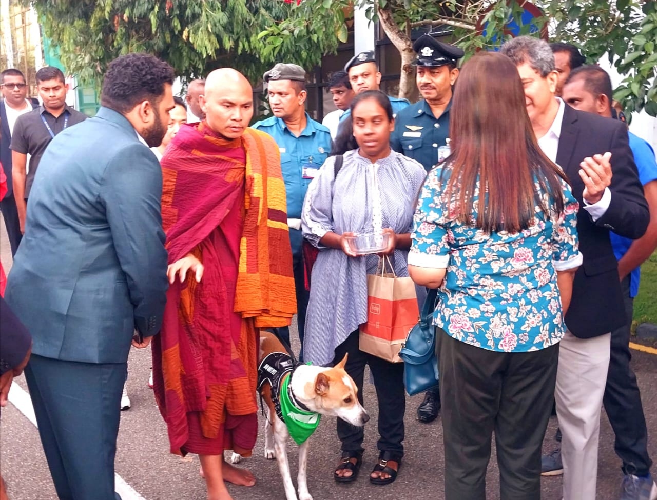 එලෙසම මෙම ස්වාමීන් වහන්සේලා පිරිස සමඟ මේ දිනවල ලෝකයේම අවධානයට පාත්ර වූ අප අසල්වැසි ඉන්දියාවේ විසු ” ආලෝකා ” නමැති සුනඛයාද මෙරටට පැමිණියේය.