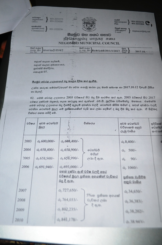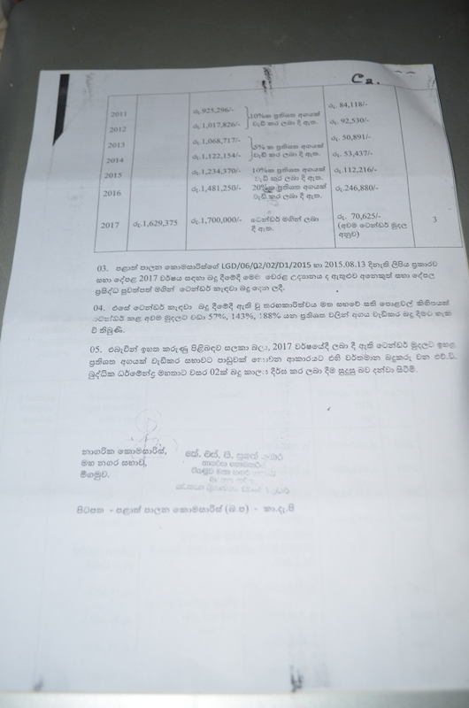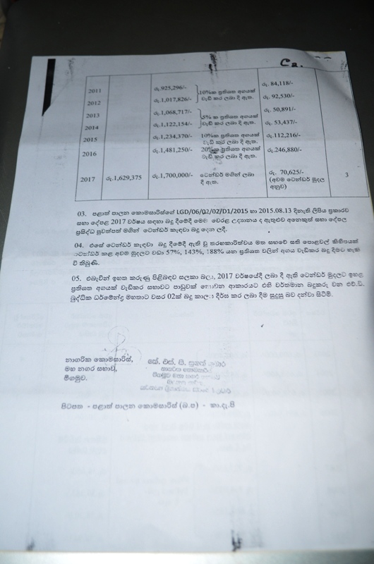 2017/10/20 වනදා මීගමුව නාගරික කොමසාරිස්වරයා කර ඇති පැහැදිලි කිරීම් අංක 04 අනුව ටෙන්ඩර් කැඳවූ කටයුතු පෙරට වඩා 57%,143%,188% යන ප්රතිශත වර්ධනයක් අත්දැක තිබියදී උක්ත කාරණයට ටෙන්ඩර් නොකැඳවන්නට හේතුව කුමක්දැයි නොදනිමු. (ක1 ලක2 ලිපිය බලන්න)