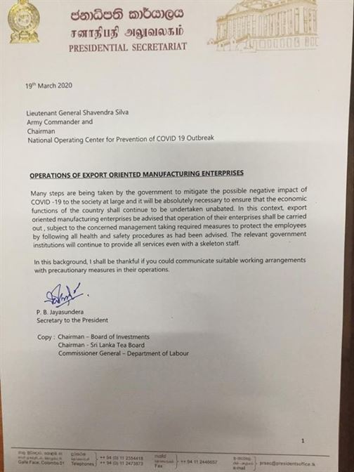 FTZජනාධිපතිවරයා විසින් යුද හමුදාපතිවරයාට දැන් ලබා දී ඇති මෙම නියෝගය අනුව අපනයන ඉලක්ක කර ගත් සියළුම කර්මාන්තශාලා ක්‍රියාත්මක කළ යුතු වේ.